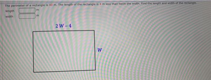 We … ights are rounded to the nearest tenth of a pound number of quarts, 3 5 weight, w 4.2 7.0 2.1 15 is the relationship between the number of quarts picked and the weight of the strawberries proportional explain. A parallelogram is a quadrilateral where opposite sides are both parallel and equal in length. Ask questions about your assignment. If the length of a rectangle is 5cm and the width of a rectangle is 2cm, then the area of the rectangle would be 5cm x 2cm = 10cm² For a rectangle, you have to check that the opposite sides (no common vertex) are equal length, and also if you check all the possibilities, you'll find that the common property is that all the possibilities of segments between. Two sides of a triangle are 5cm and 9cm long, what can be the length of its thirdsider. This will help us to improve better. The demonstrator shows how to plug in the known values of a rectangle, and then how to use the formula for area to solve for the variable in question. Thread originally posted in a technical math section, so is missing the homework template. Now, we also know that the length is twice the width meaning it is 2 (x) or 12. If you happen to know the distance around the rectangle, which is its perimeter, you can solve a pair of equations for l and w. Length of a rectangle = area ÷ breadth. If the perimeter of a rectangle is 278 meters and the length is 1 meter longer than twice the width, then what are the length and width?
